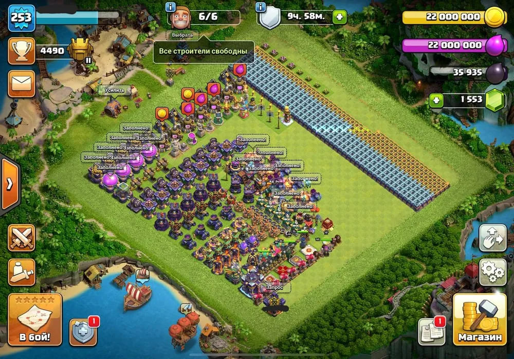 🏛Ратуша (ТХ) уровень: 15; 🏠Дом строителя уровень: 9; 📈Уровень: 253; 👷🏻Строителей: 6/6