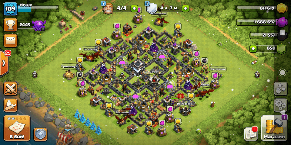 🏛Ратуша (ТХ) уровень: 9; 🏠Дом строителя уровень: 7; 📈Уровень: 109; 👷🏻Строителей: 4/4