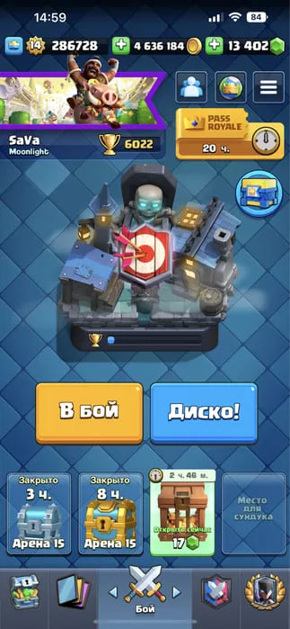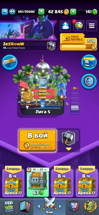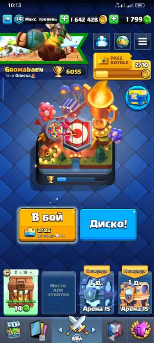 🚩Арена: 14; 🃏Карты: 99/107; ⚡Легендарные карты: 14/18;