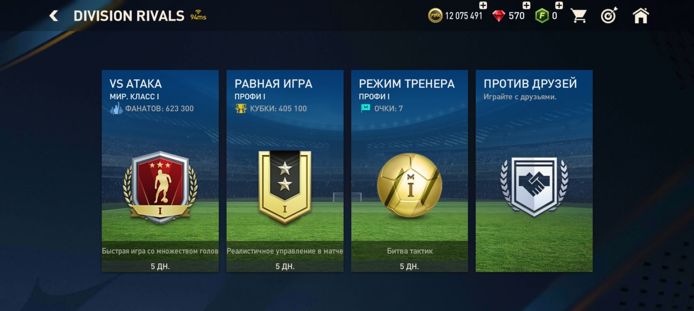 💰Золото: 12 075 491📗Fifa-point: 0 🛑570💪 Игроки : 55