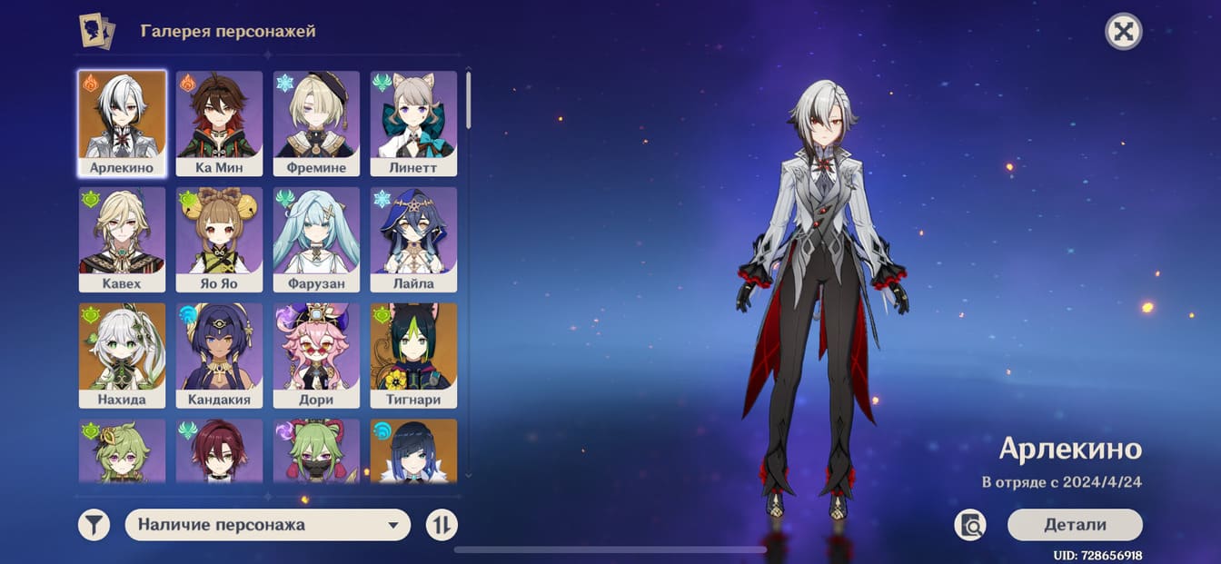 📈 Ранг: 60 🧍♀️ Персонажи: Арлекино, Чжун Ли, Е Лань, Нёвиллет и другие ✨ Примогемы: 43