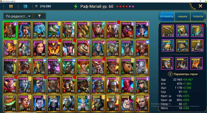 ⚡Уровень: 90 🔥Количество героев:: 276 💪Сила: 4,84 млн