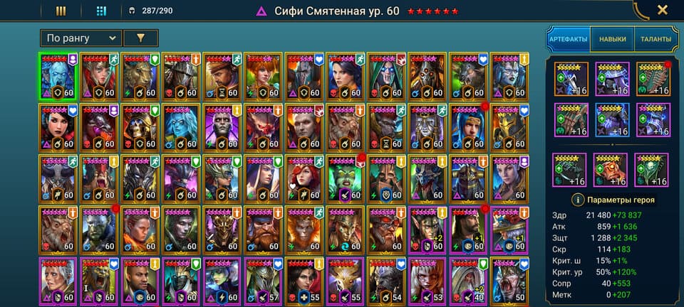⚡Уровень: 100 🔥Количество героев:: 287 💪Сила: 13,47 млн