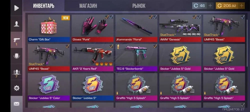 💰Голда: 206.92;🔪Ножи: 1;⭐️Редкие скины: 5