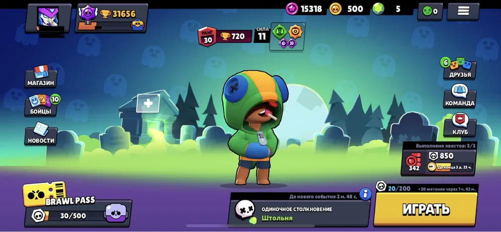 🏆Кубков: 31656; ⭐Уровень: 237; 💪Бойцов: 60/72; ⚡Леги: Леон, Спайк, Амбер, Ворон, Сэнди, Мег;