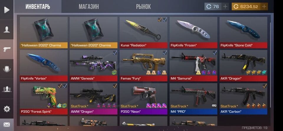 💰Голда: 6234.52; 🔪Ножи: 4; ⭐️Редкие скины: 5