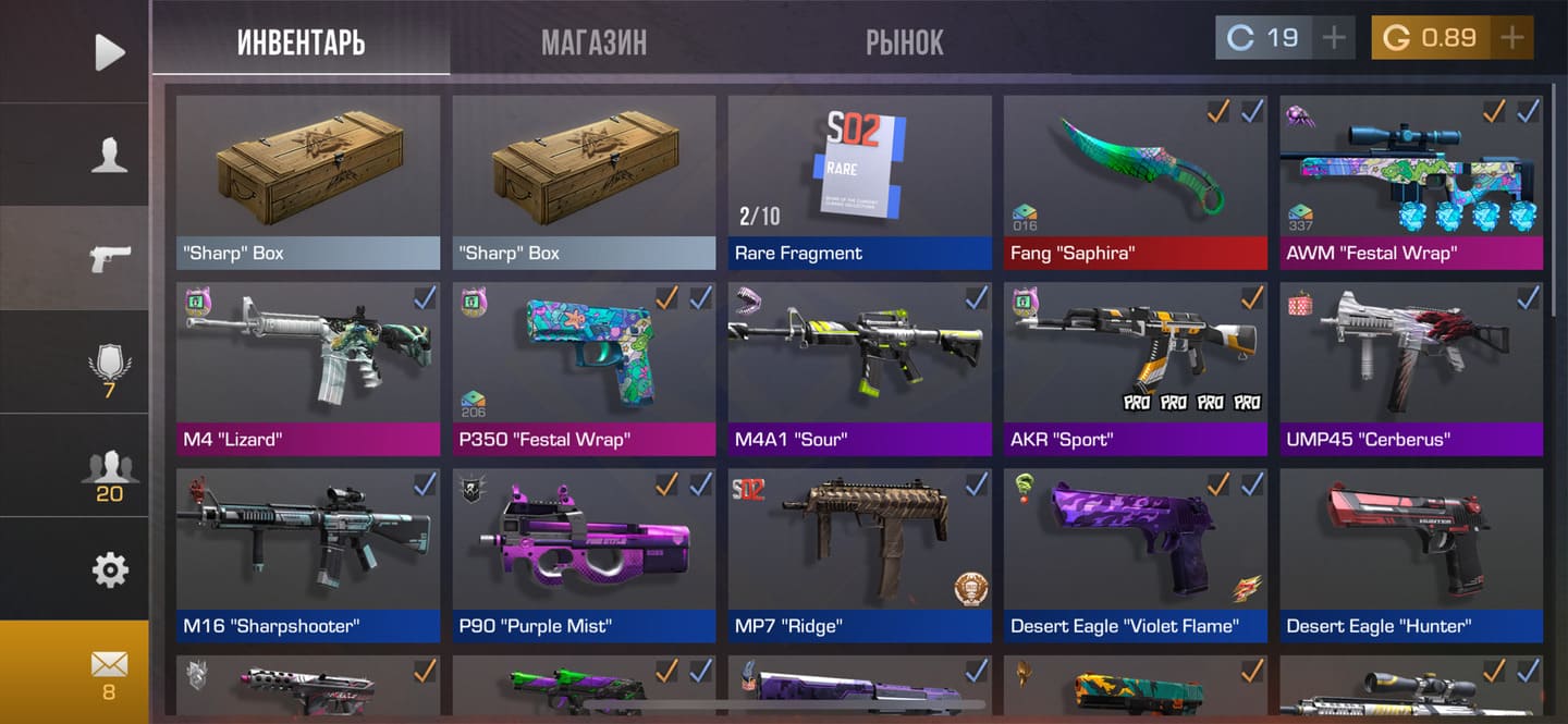 💰Голда: 0.89; 🔪Ножи: Fang "Saphira"; ⭐️Редкие скины: 2