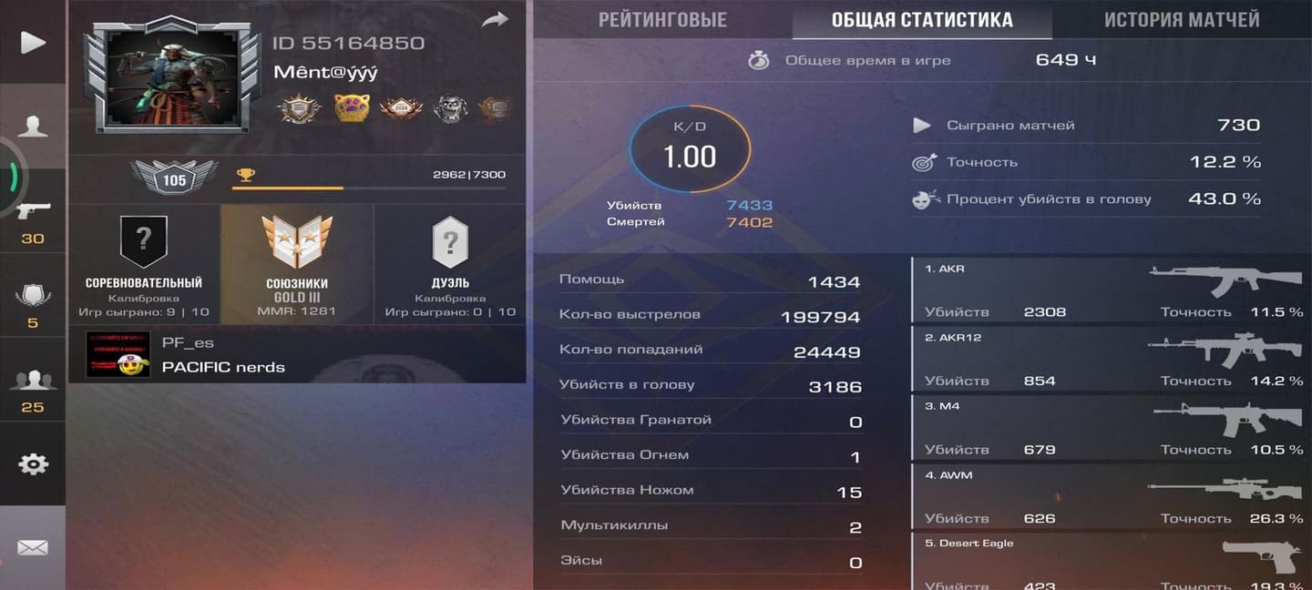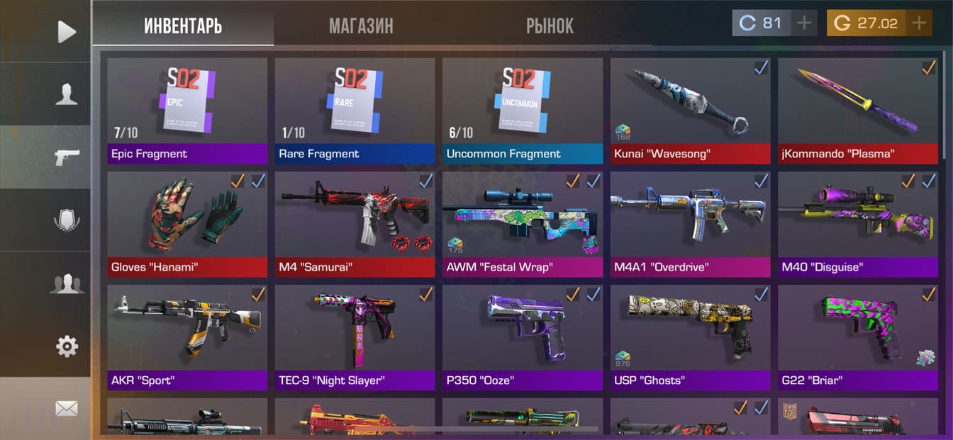 💰Голда: 27.02; 🧤Перчатки: "Hanami"; 🔪Ножи: Kunai "Wavesong", jKommando "Plasma" ⭐️Редкие скины: 4