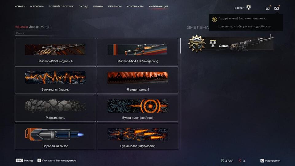 💲Варбаксы - 4643, 💵Кредиты - 0, 👑Короны - 54;